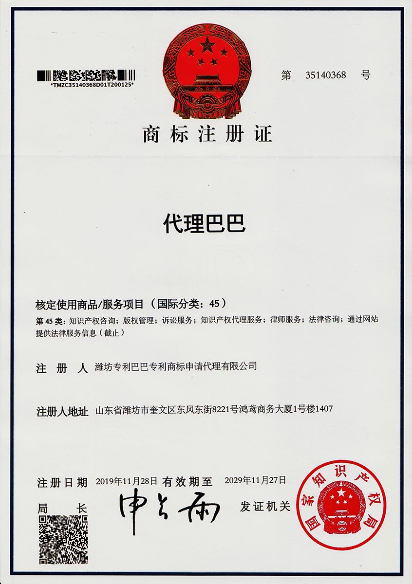 代理巴巴商标证书