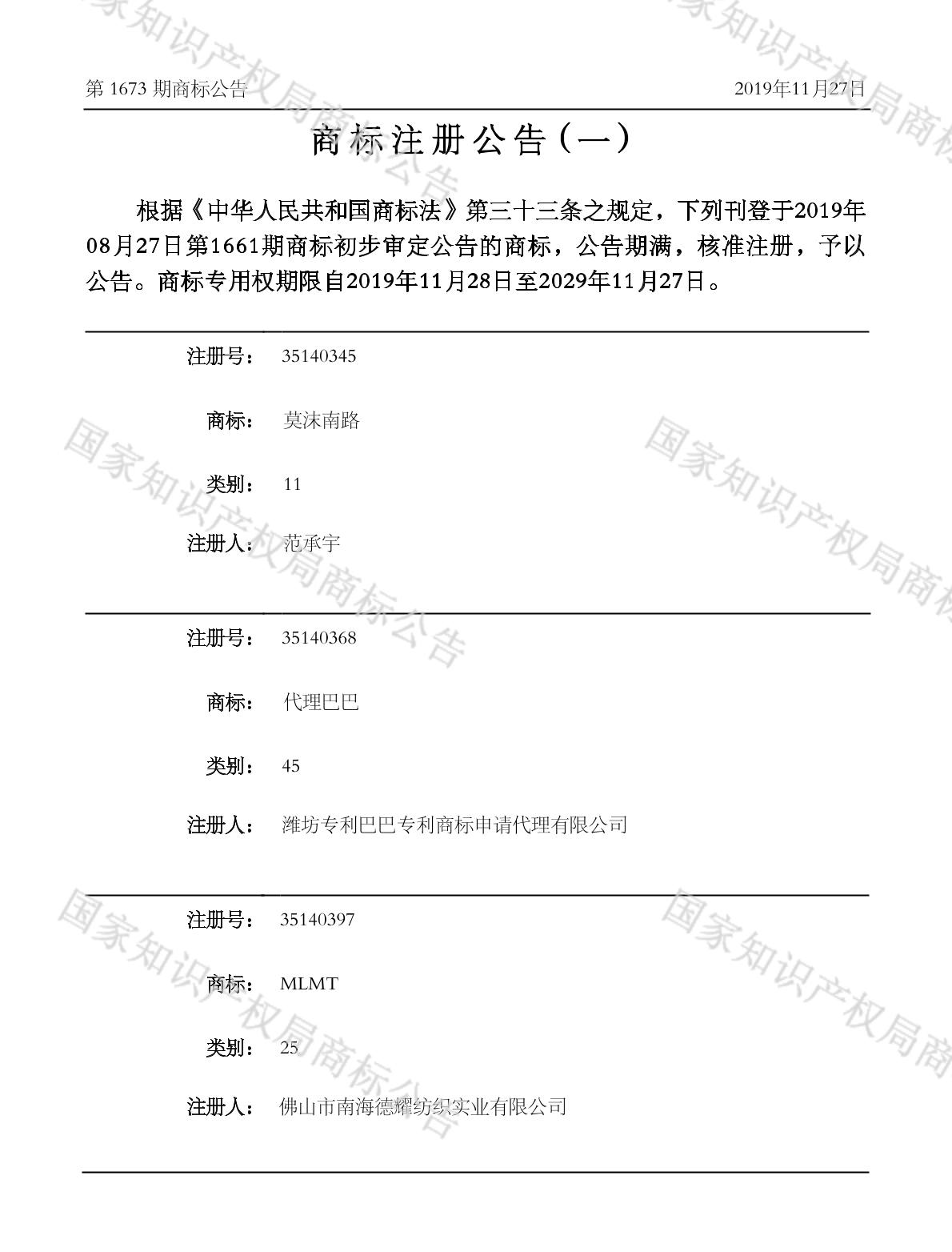 2019年11月28日,潍坊专利巴巴专利商标申请代理有限公司申请的代理巴巴商标获得国家商标局注册公告,注册公告期号为:第1673期。