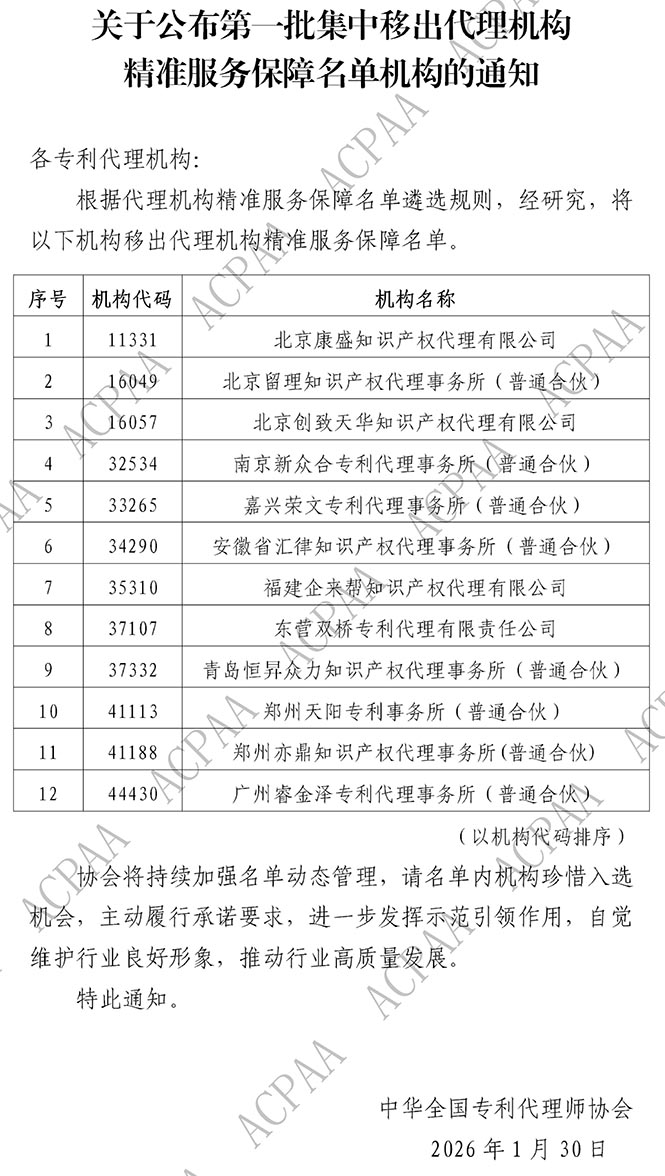 关于公布第一批集中移出专利代理机构精准服务保障名单机构的通知